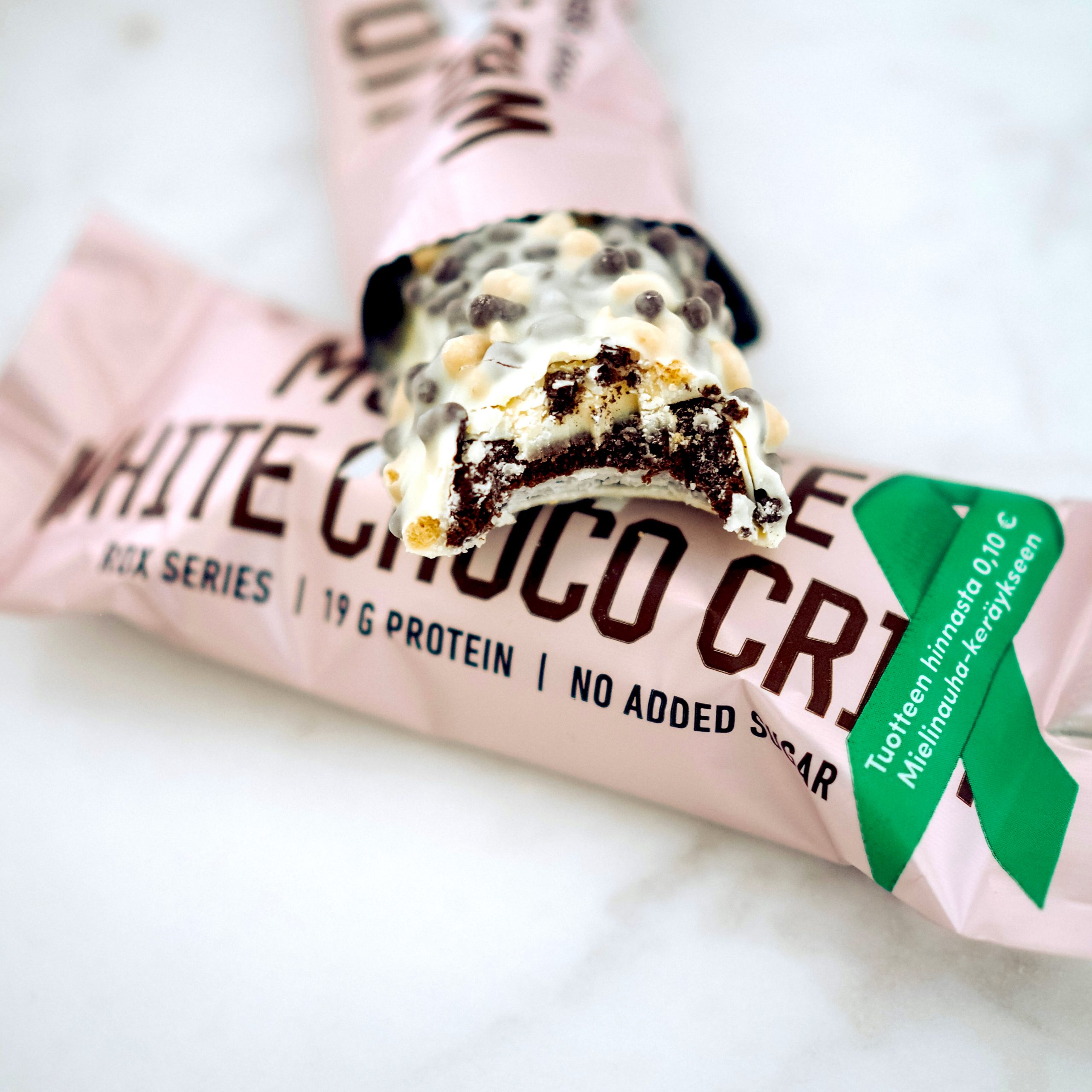 Valkosuklaa 34 % (makeutusaine (maltitoli), kaakaovoi, maitojauhe, emulgointiaine (lesitiinit), kosteudensäilyttäjä (glyseroli), maitoproteiini*, hydrolysoitu kollageeni*, soijaproteiini*, kaakaojauhe, makeutusaine (maltitoli), kaakavoi, tapiokatärkkelys, aromit, auringonkukkaöljy, emulgointiaine (lesitiinit), suola, makeutusaine (sukraloosi)